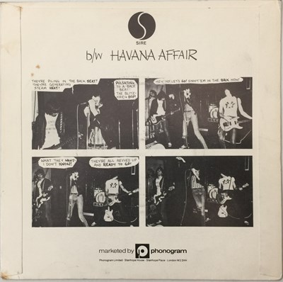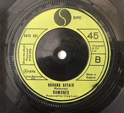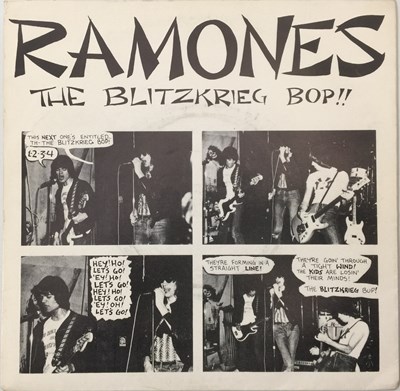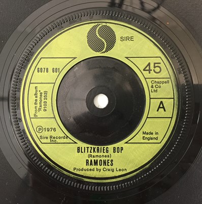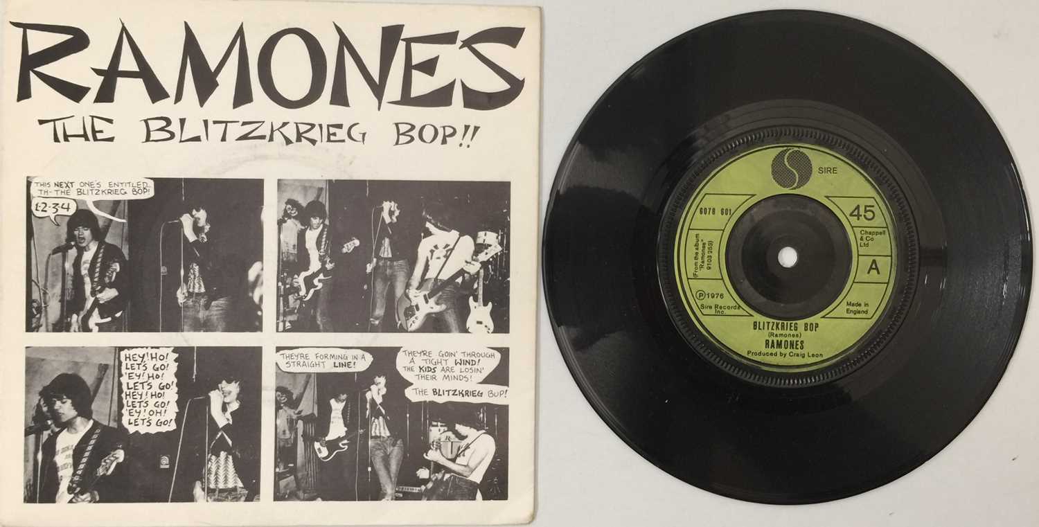RAMONES - BLITZKRIEG BOP 7" (ORIGINAL UK P/S COPY - SIRE 6078 601). Wicked to see complete original (1976) UK 7" picture sleeve copy of The Blitzkrieg Bop!! The record (Sire, green injection labels, 6078 601) is in Ex condition showing a couple of light and minor surface marks - without any heavier feelable scratches. The original picture sleeve is in Ex condition showing some minor ringwear - without any rips, tears or splits.